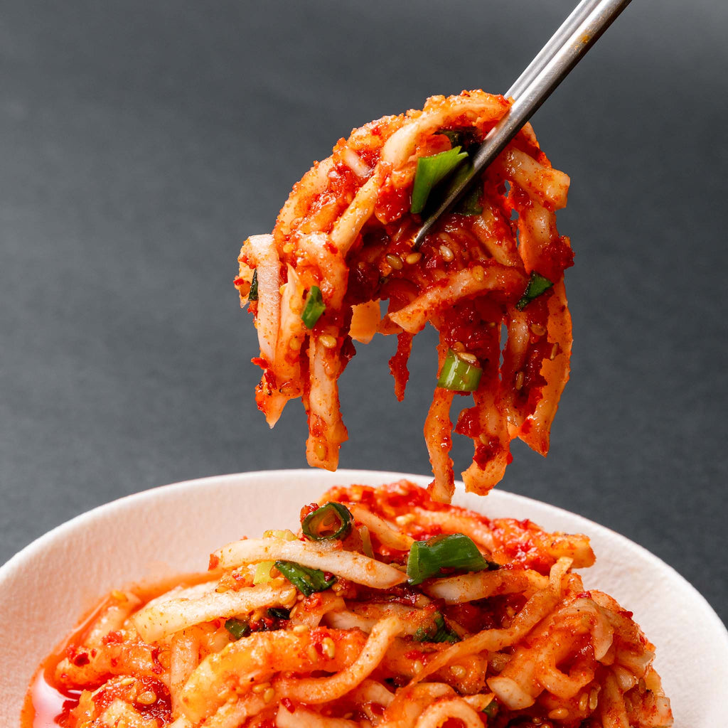 【味グラフ】辛さ:★★☆☆☆酸味:★★★☆☆塩味:★☆☆☆☆甘み:★★★☆☆ 【商品説明】食べやすい細切り大根キムチ。程よい酸味と甘みがクセになります!【原材料】大根(国産)唐辛子(韓国産)にんにくしょうがアミエビ天然だし食塩調味料(アミノ酸等)